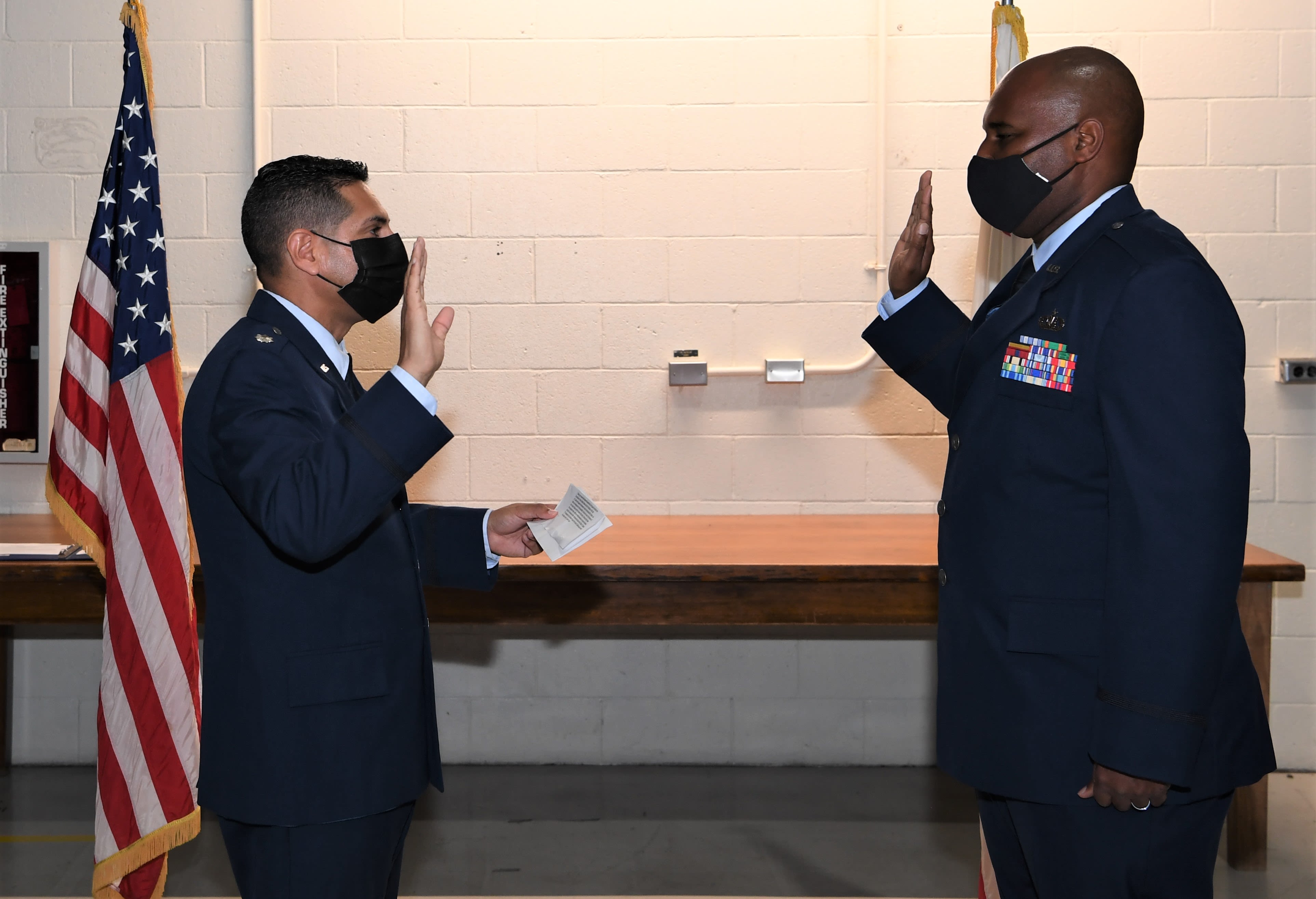 U.S. Air Force Lt. Col. Chaplain David Sarmiento, left, with the 163rd Attack Wing, California Air National Guard, administers the Oath of Office to Master Sgt. Rene Martin III, to commission him as a new 195th Wing Staff chaplain, Oct. 2, at Sepulveda Air National Guard Station in Van Nuys. Martin started his path to chaplaincy over nine years ago when encouraged by Sarmiento to consider becoming a military chaplain. Martin was the 195th Wing’s superintendent of religious affairs prior to his promotion.