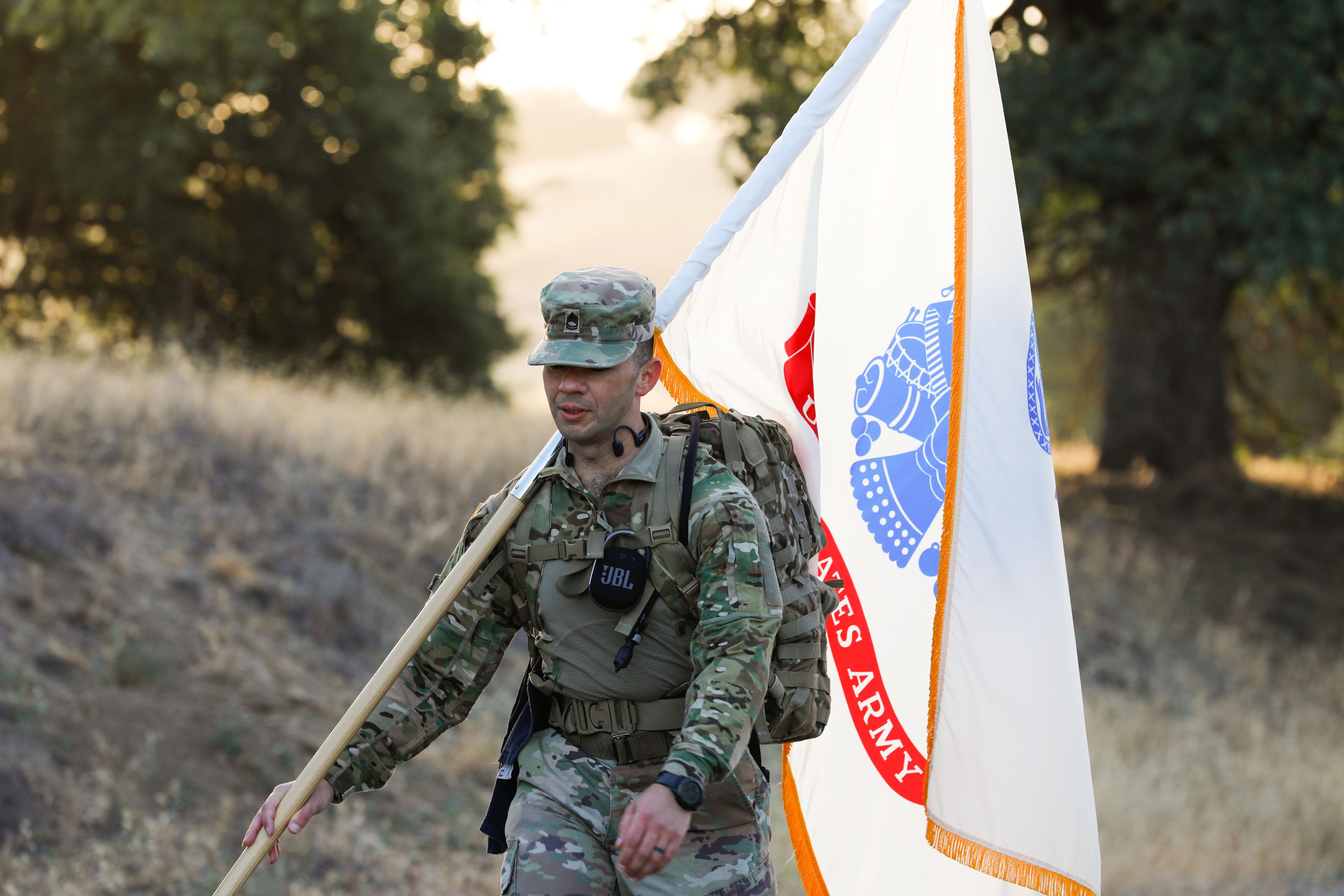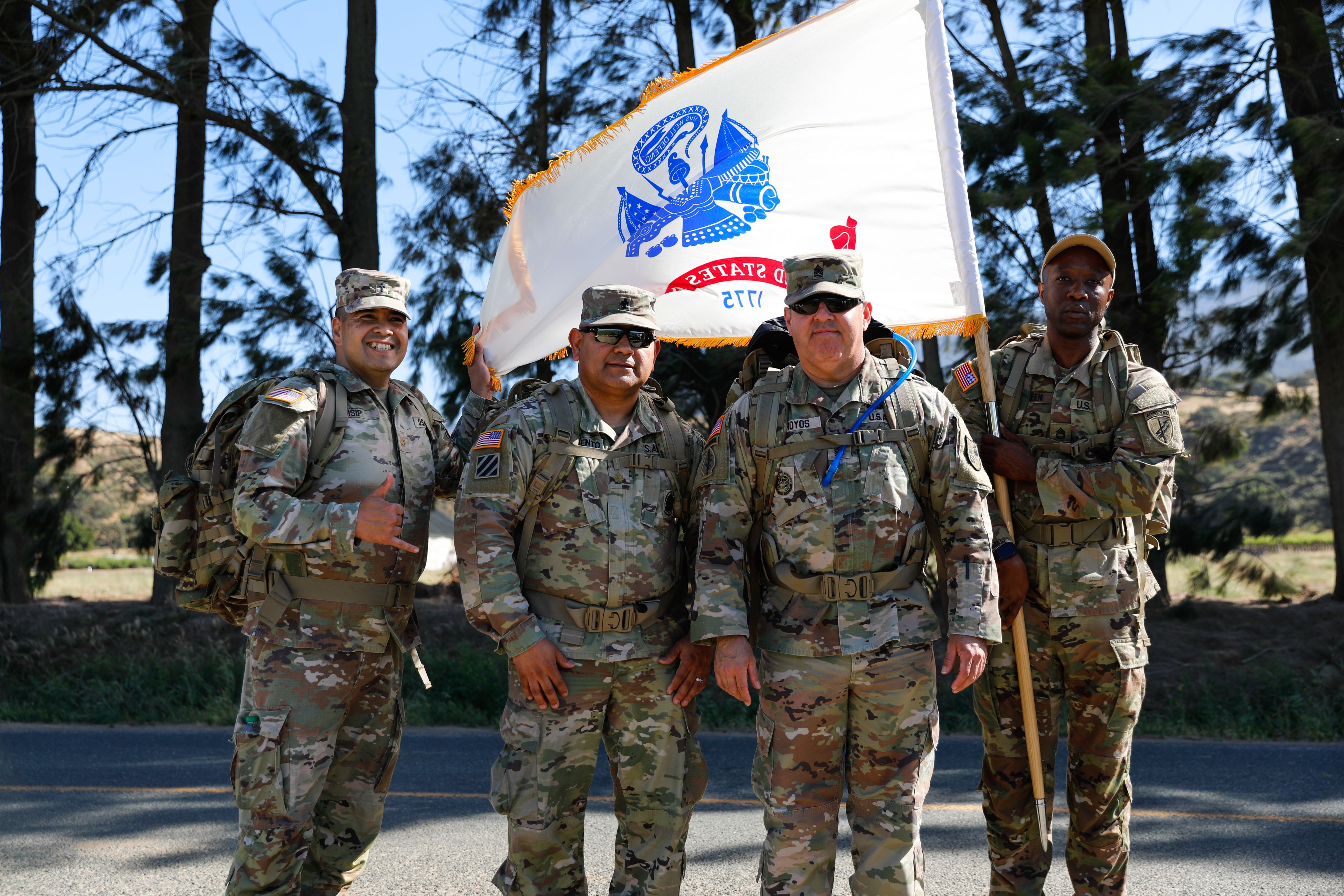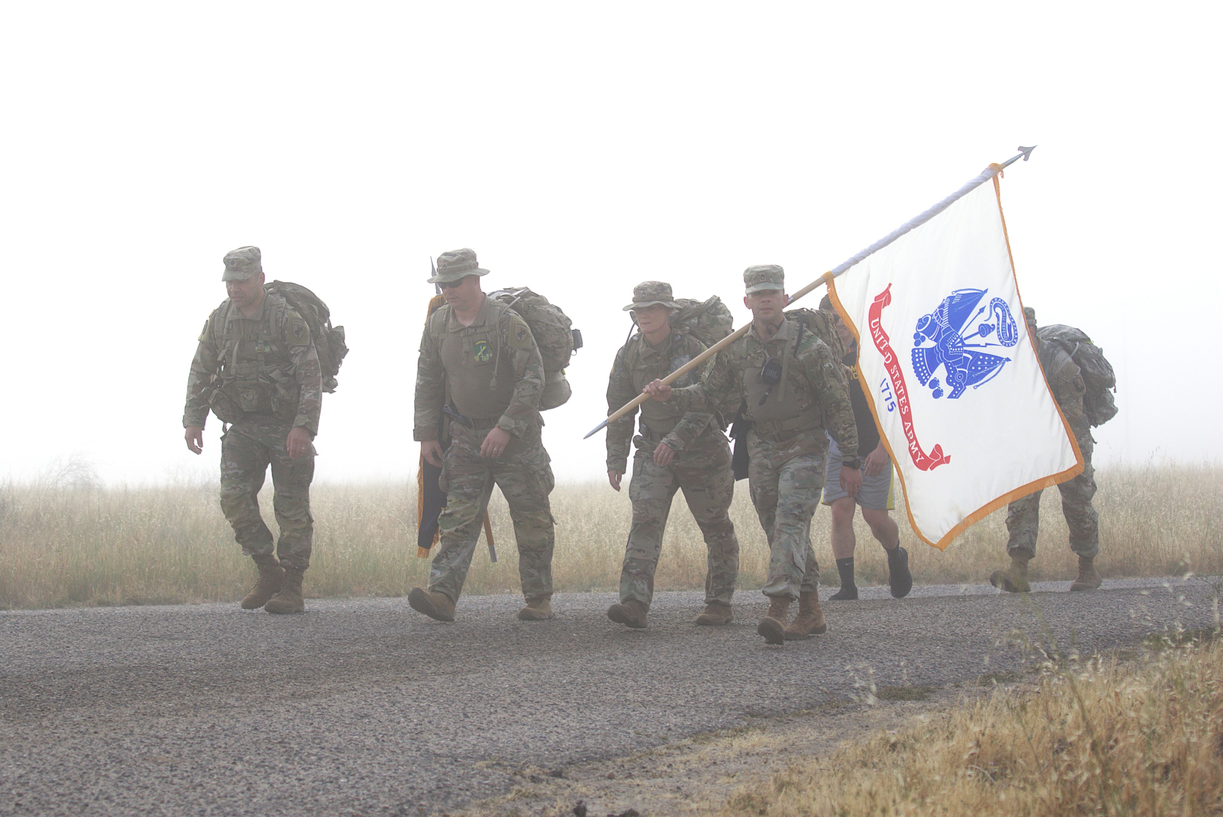 The ruck march began at dawn at Camp Roberts, with many applauding the eight participants in the first leg as they set off. With the Army colors swaying high on the shoulder of Sgt. 1st Class Christopher Monk, Soldiers and civilians alike smiled with determination, knowing they were marching for a unique milestone in U.S. Army history.