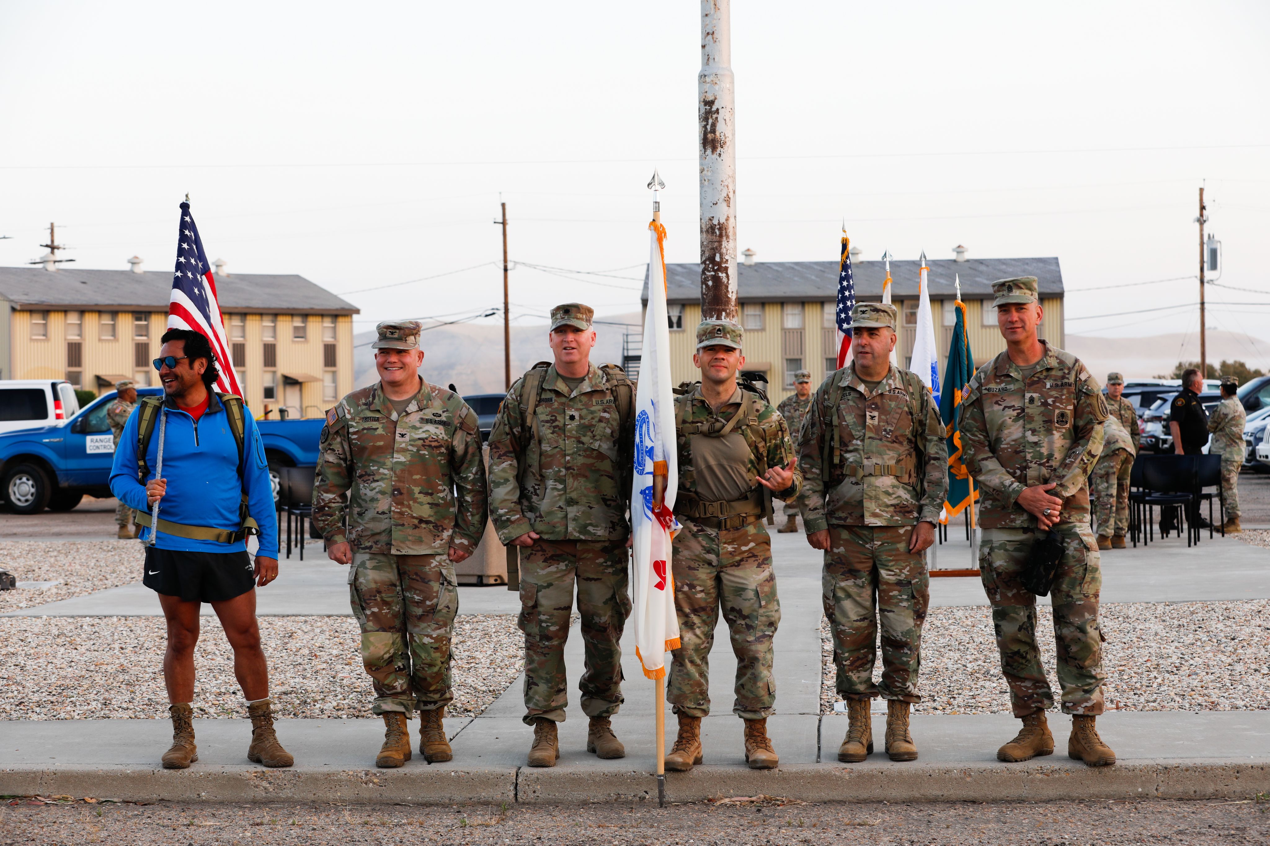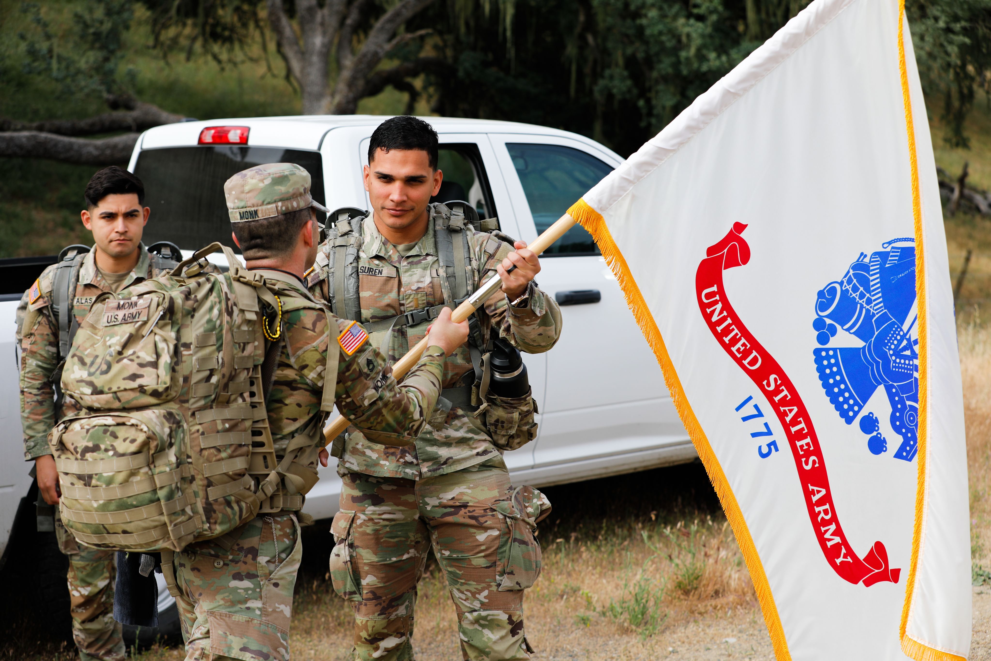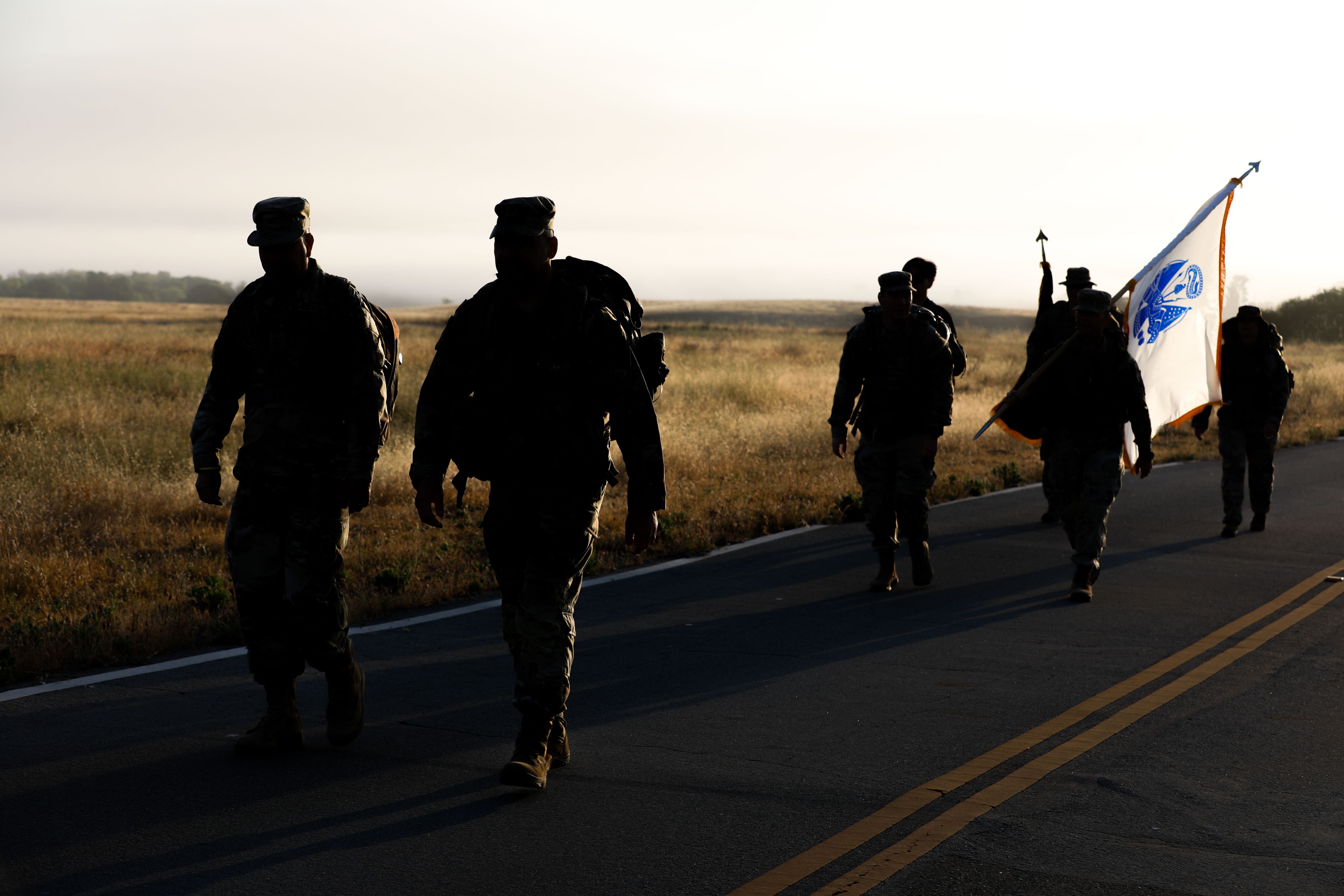The ruck march began at dawn at Camp Roberts, with many applauding the eight participants in the first leg as they set off. With the Army colors swaying high on the shoulder of Sgt. 1st Class Christopher Monk, Soldiers and civilians alike smiled with determination, knowing they were marching for a unique milestone in U.S. Army history.