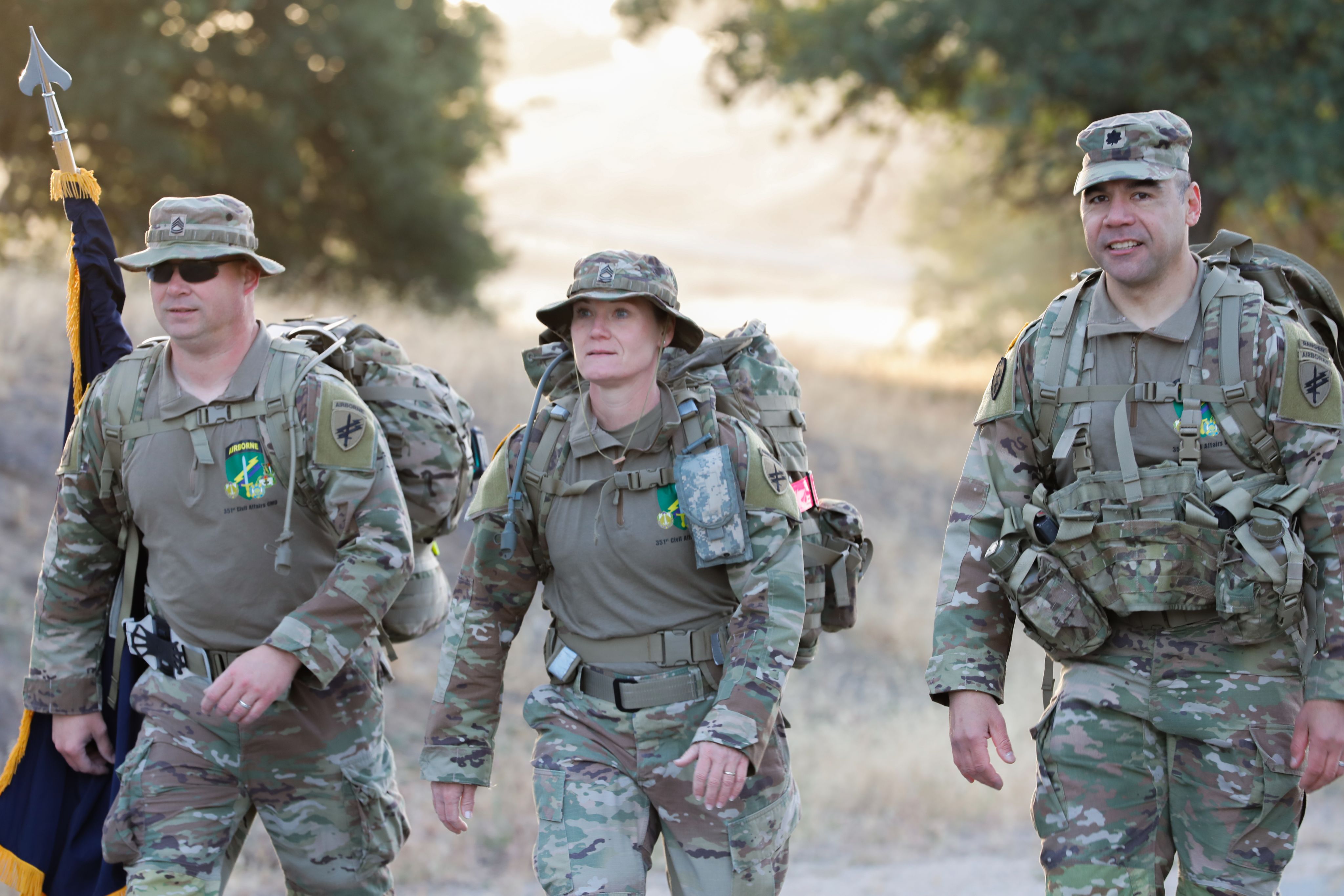 U.S. Army Sgt. 1st Class Lanny Stottmeister, Master Sgt. Kimberlee Hilliard, and Lt. Col. Hermann Blancaflor, 351st Civil Affairs Command, participates in the 250 mile ruck march, commemorating the 250th U.S. Army birthday at Camp Roberts, Calif., May 7, 2025. The ruck march covers 250 miles across central California, with participants completing different sections of the route that stretches from Camp Roberts to Camp Parks in Dublin, Calif., all while carrying the U.S. flag, U.S. Army colors, and a binder containing over 500,000 names of fallen service members. (U.S. Army National Guard photo by Spc. William Franco Espinosa)