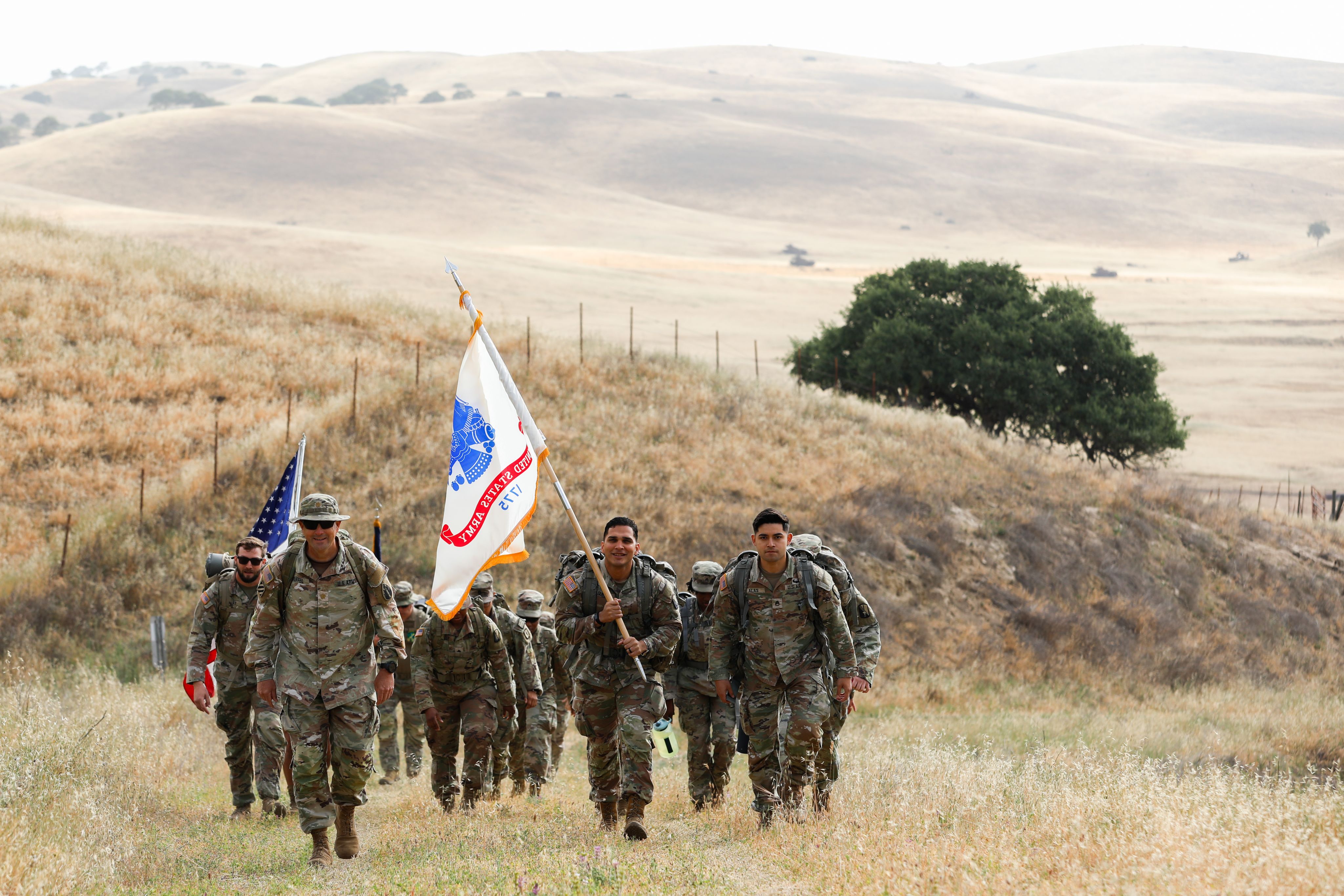 U.S. Army troops march during the 250 mile ruck march commemorating the 250th U.S. Army birthday at Camp Roberts, Calif., May 7, 2025. The ruck march covers 250 miles across central California, with participants completing different sections of the route that stretches from Camp Roberts to Camp Parks in Dublin, Calif., all while carrying the U.S. flag, U.S. Army colors, and a binder containing over 500,000 names of fallen service members. (U.S. Army National Guard photo by Spc. William Franco Espinosa)