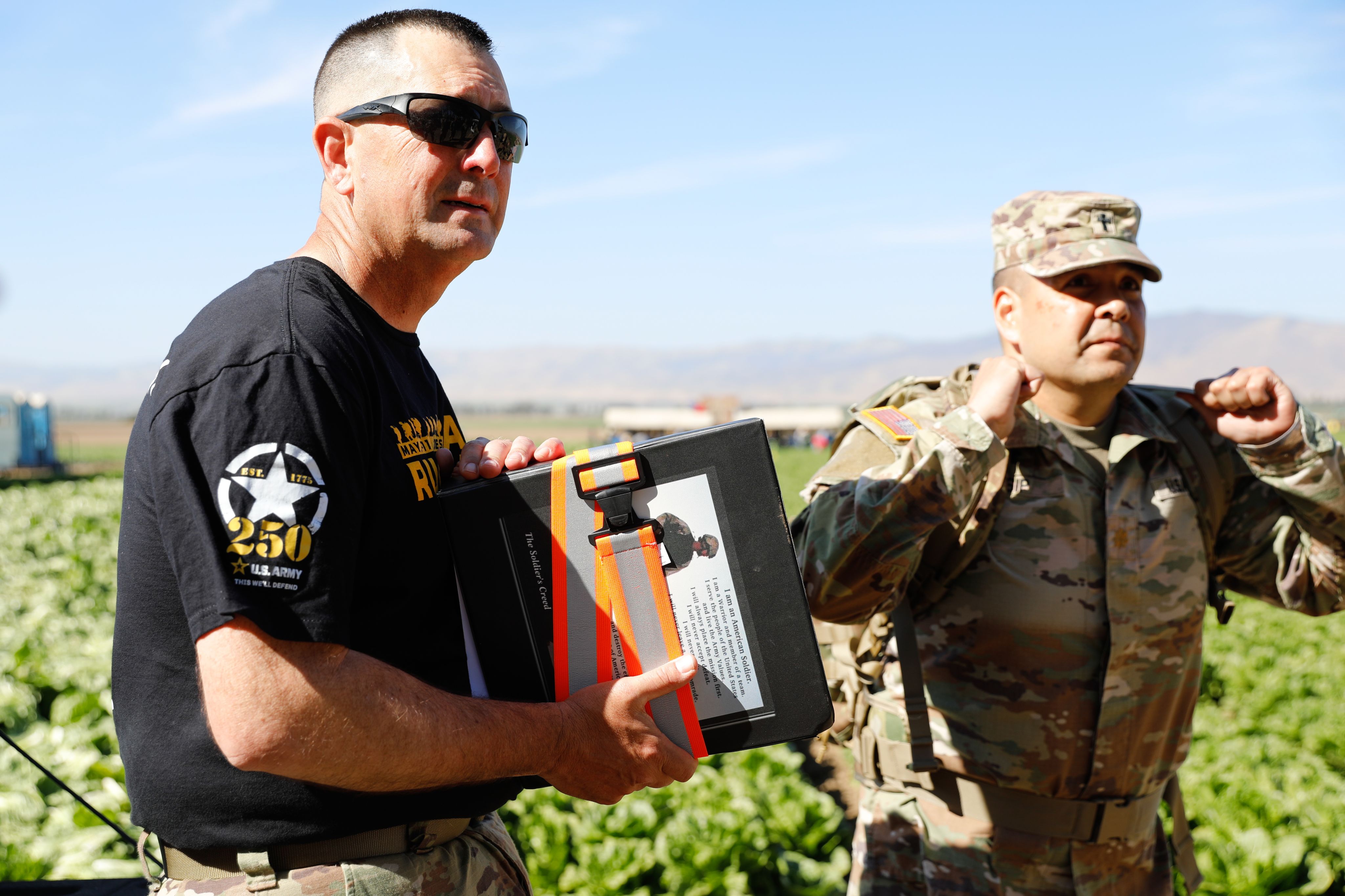 U.S. Army cadre prepares to hand a binder containing over 500,000 names of fallen service members to a Soldier participating in the 250 mile ruck march commemorating the 250th U.S. Army birthday at Soledad, Calif., May 8, 2025. The ruck march covered 250 miles across central California, with participants completing different sections of the route that stretched from Camp Roberts to Camp Parks in Dublin, Calif., all while carrying the U.S. flag, U.S. Army colors, and a binder containing over 500,000 names of fallen service members. (U.S. Army National Guard photo by Spc. William Franco Espinosa)