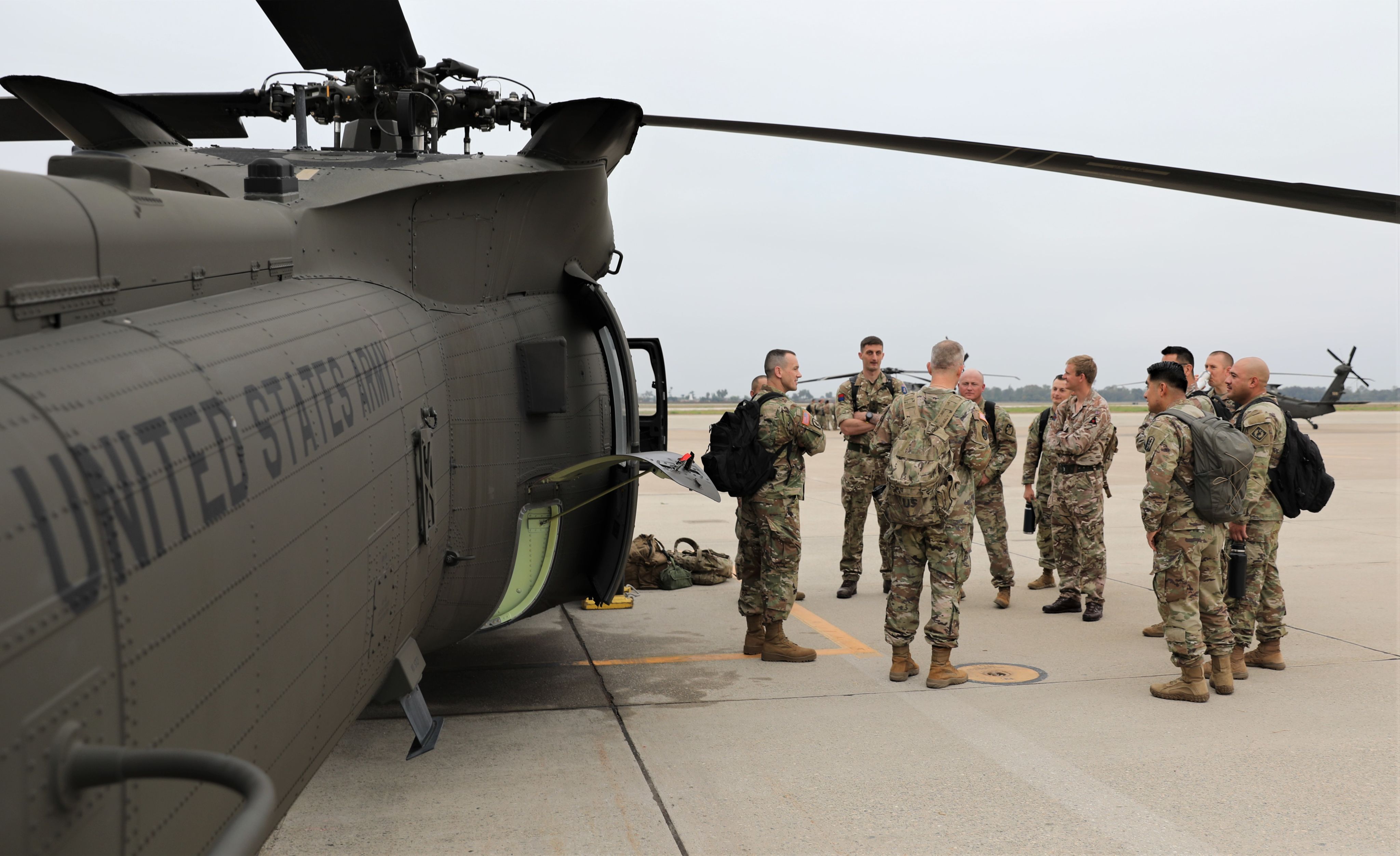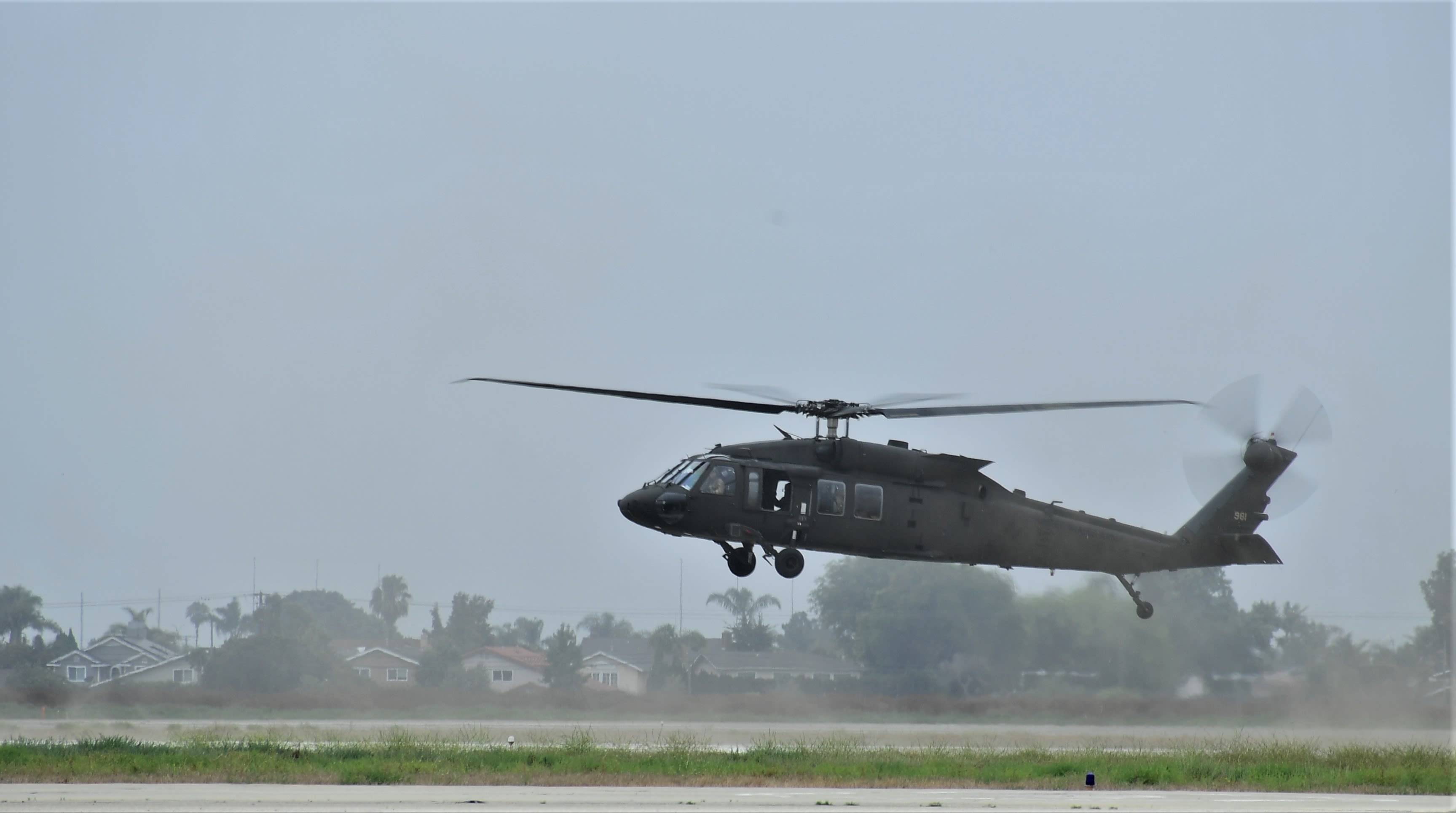 LOS ALAMITOS, Calif.—A dust cloud whipped into the air as four UH-60 Black Hawks with the 40th Combat Aviation Brigade ascended from the airstrip at Joint Forces Training Base, Los Alamitos, on July 12, 2022. Inside the helicopters, military leaders from Canada, Germany, Australia, the United Kingdom, the Netherlands, and the United States cross-talked over their headsets about various buildings and structures as they flew over Los Angeles County.