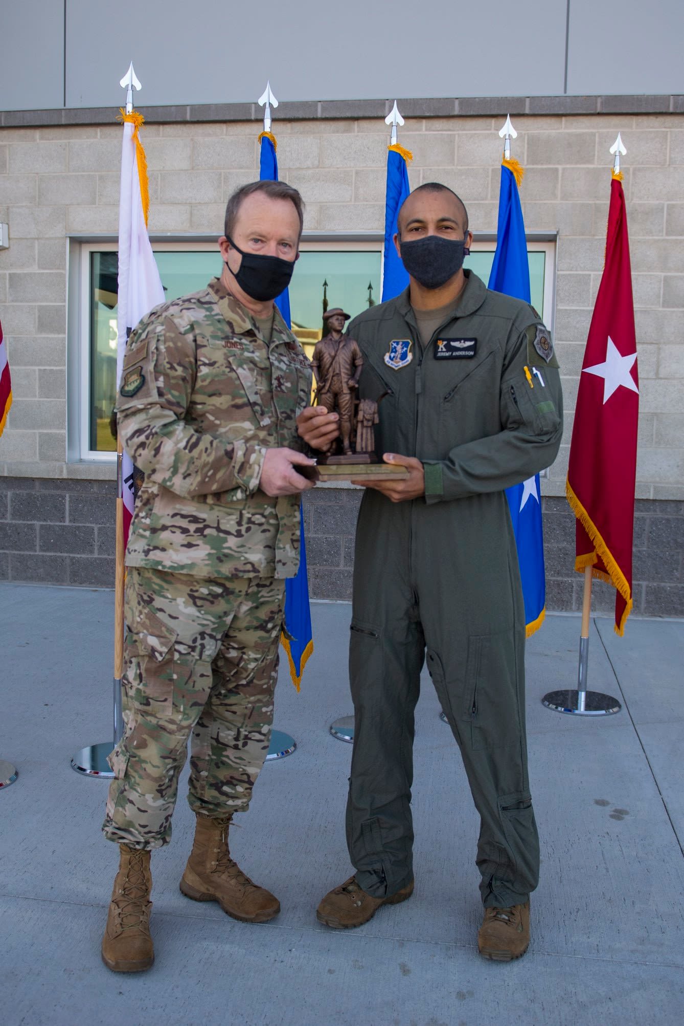 Above: U.S. Air Force Maj. Jeremy Anderson, right, from the 129th Rescue Wing, receives the California Air National Guard Field Grade Officer of the Year trophy from Maj. Gen. Gregory Jones, Feb. 7, at Moffet Federal Air Field in Mountain View. (U.S. Air National Guard photo by Tech. Sgt. Deepak Prasad)