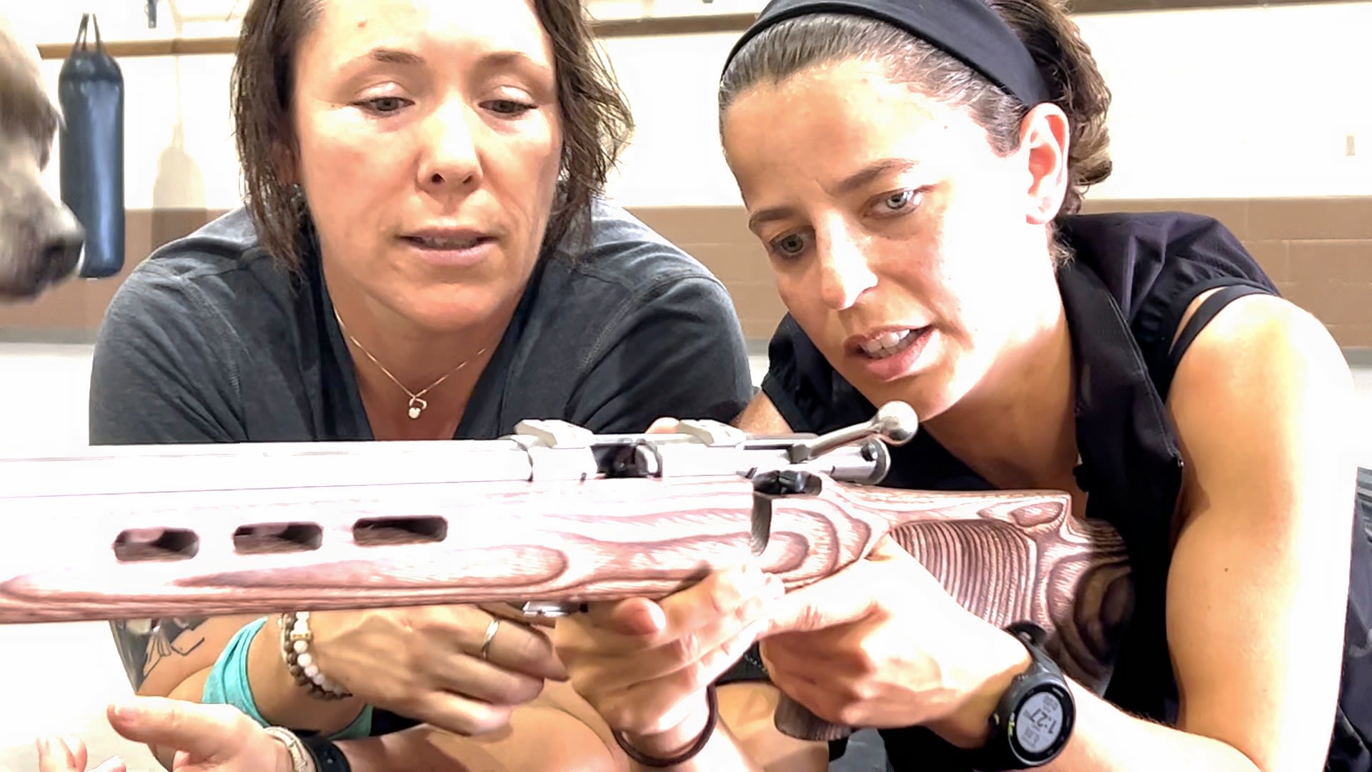 Quickly launching themselves into a prone shooting position, the athletes gain control of their breath, focus in on their target, and take the practice shot.