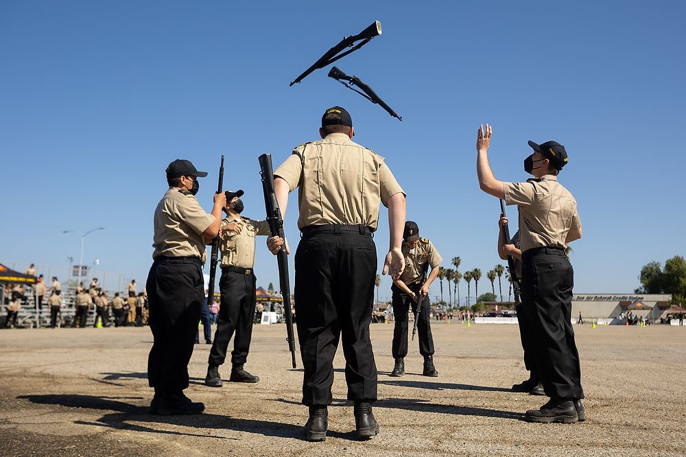 California Cadet Corps Cadet Staff Sgt. Lyanni Santillan, from Cajon High School in San Bernardino, spins his rifle during an exhibition drill performance at the Corps’ statewide drill competition, April 23, at Joint Forces Training Base, Los Alamitos. (U.S. Air National Guard photo by Staff Sgt. Crystal Housman)