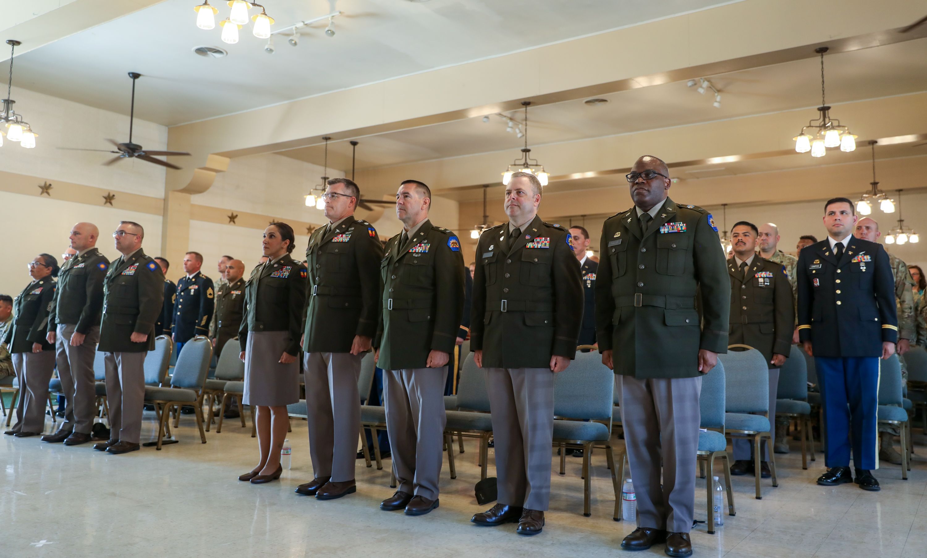 The official party stands at attention alongside service members and their families during the national anthem at the class 25-002 graduation ceremony. (U.S. Army National Guard Photo by Staff Sgt. Chau Le)