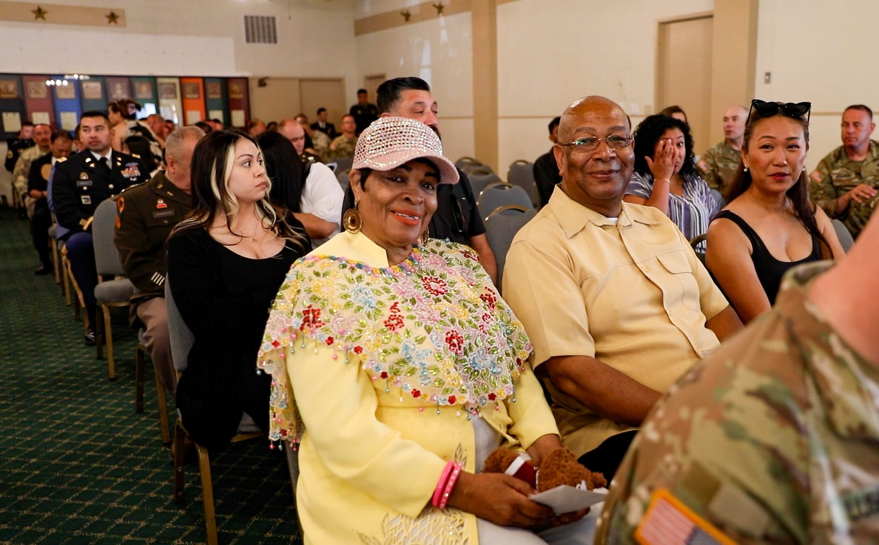 Family members of warrant officers from class 25-002 settle into their seats before the Warrant Officers Candidate school graduation ceremony starts at Camp San Luis Obispo, Calif., July 12, 2025. (U.S. Army National Guard Photo by Staff Sgt. Chau Le)