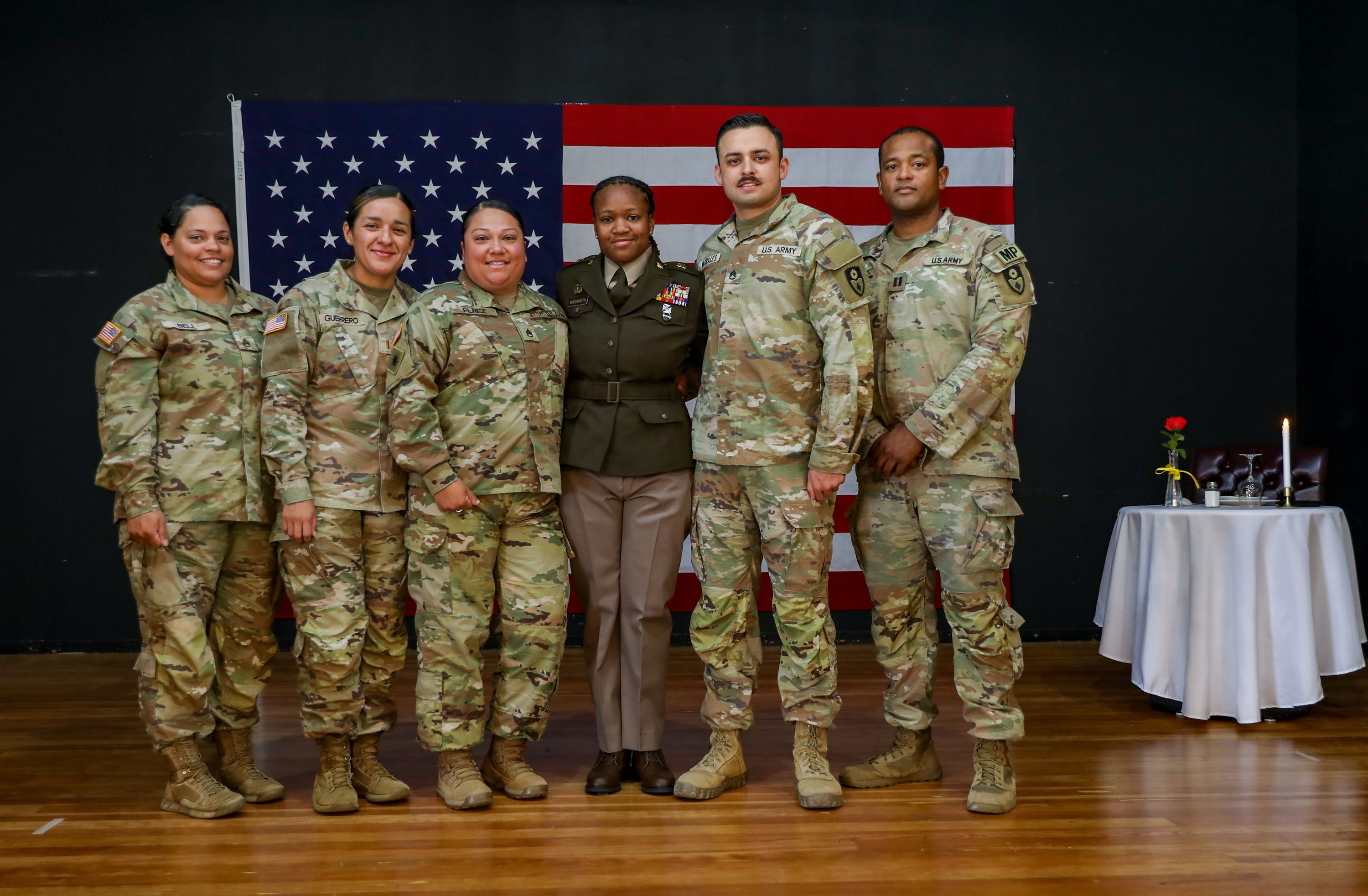 Warrant Officer LaToya Wadsworth poses for a photo with noncommissioned officers from one of her previous units. (U.S. Army National Guard Photo by Staff Sgt. Chau Le)
