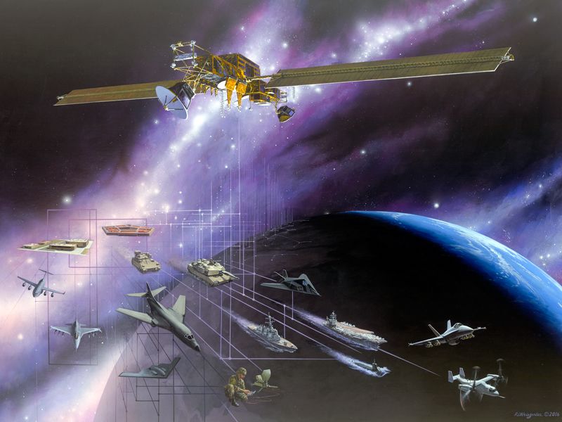 A Milstar satellite in space above an image of earth with a grid of inter-connecting lines representing the communications with Air Force, Army, Navy and Marine users.