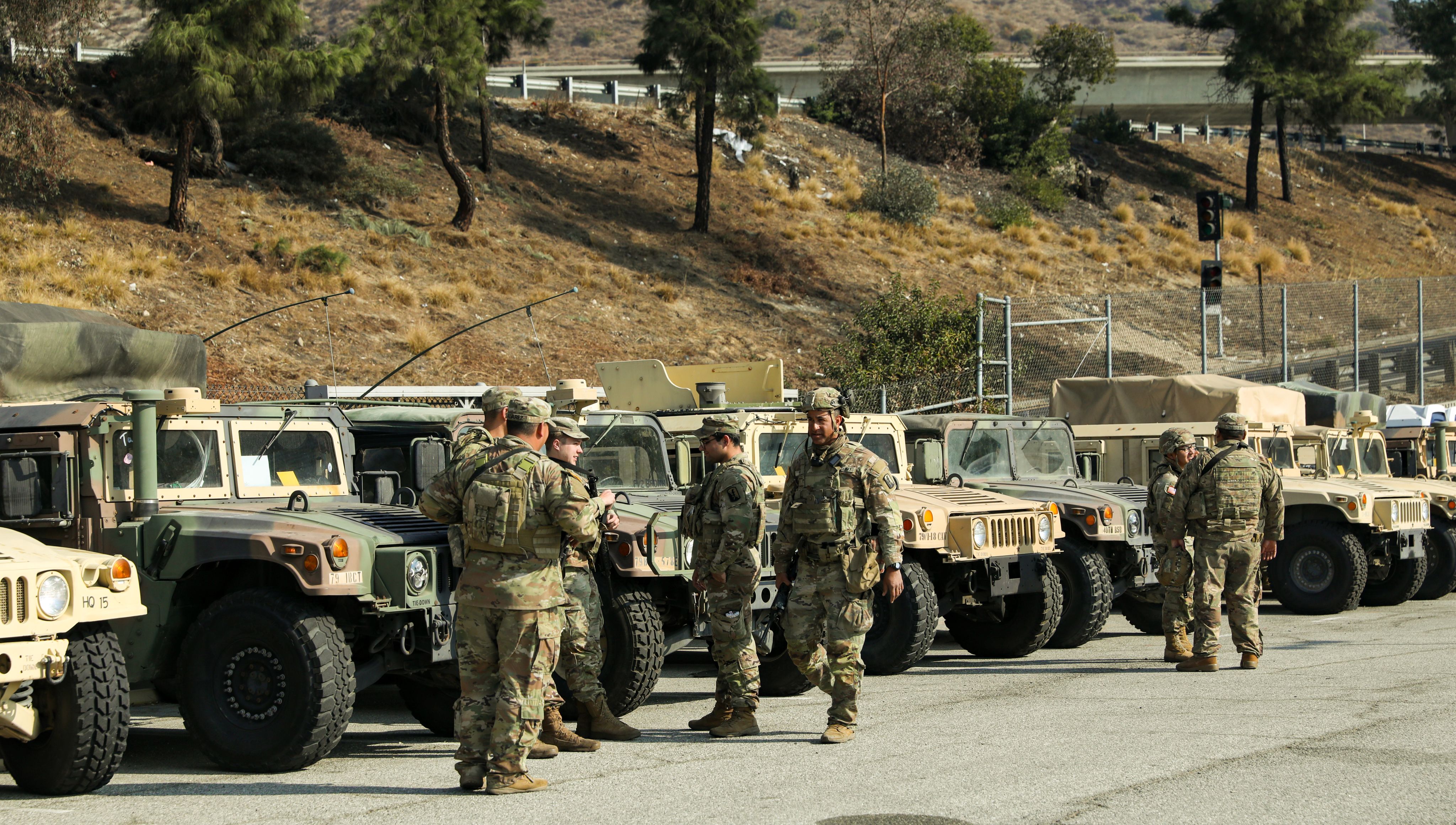 California National Guard Soldiers from the 18th Cavalry and 160th Infantry Regiments gather for a group photo at the Los Angeles Communications Center, Calif., on Jan. 19, 2025.