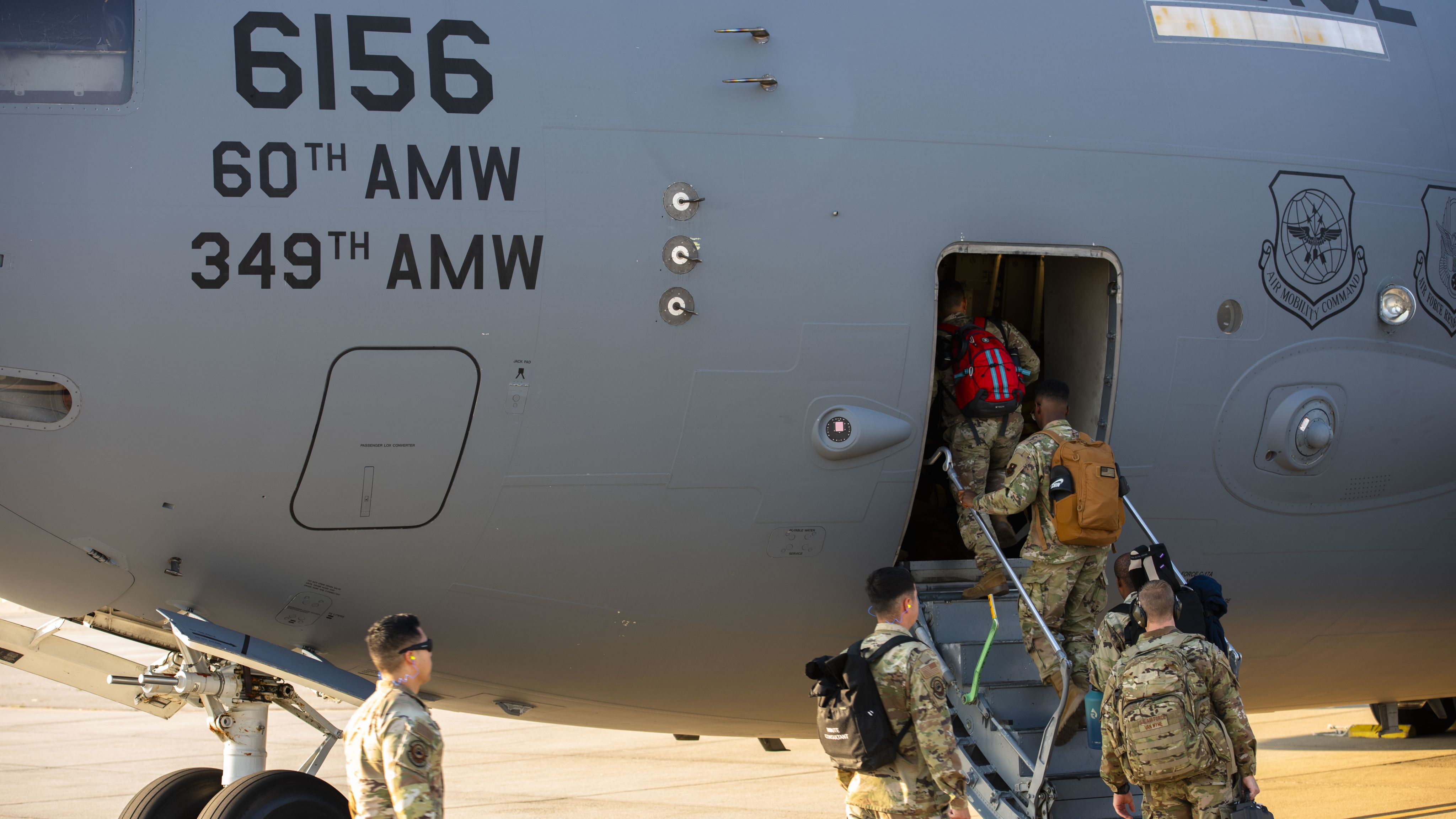 Airmen with the 163rd and 147th Maintenance Squadrons board a C-17 Globemaster III at March Air Reserve Base, Calif., to participate in REFORPAC.
