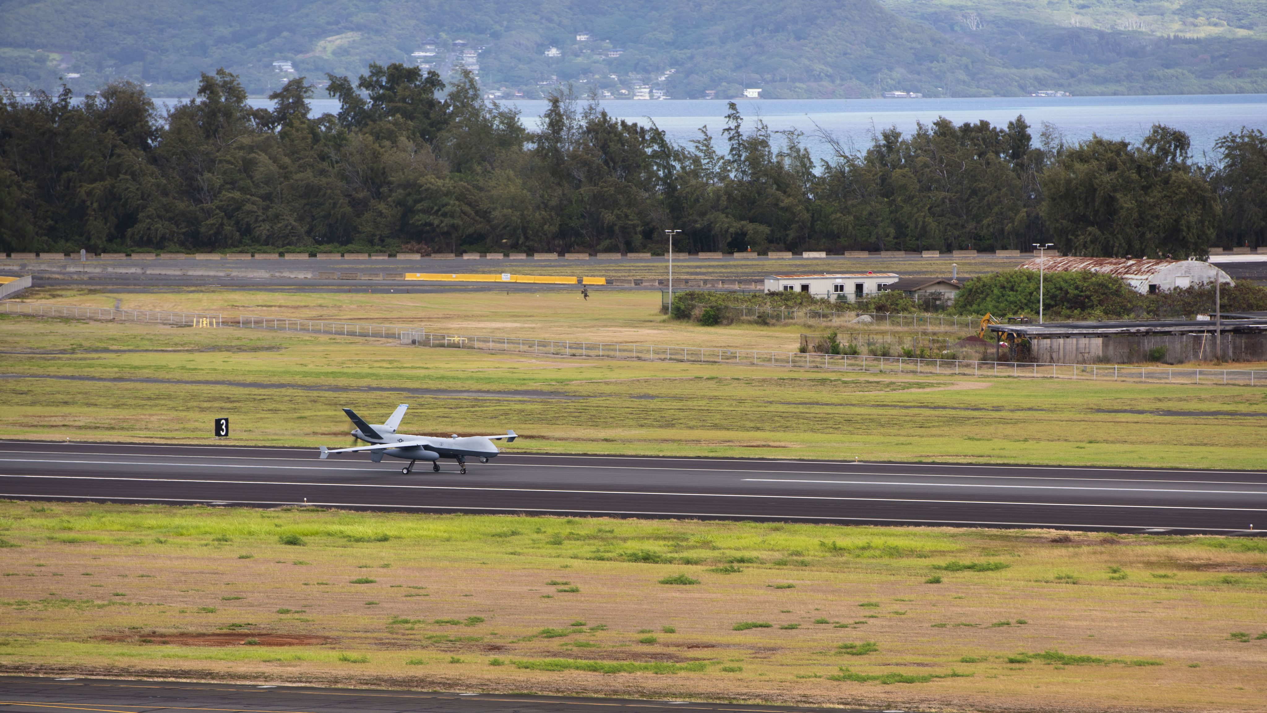 An MQ-9A Reaper unmanned aerial vehicle assigned to the 163d Attack Wing lands at Marine Corps Base Hawaii while en route to REFORPAC.