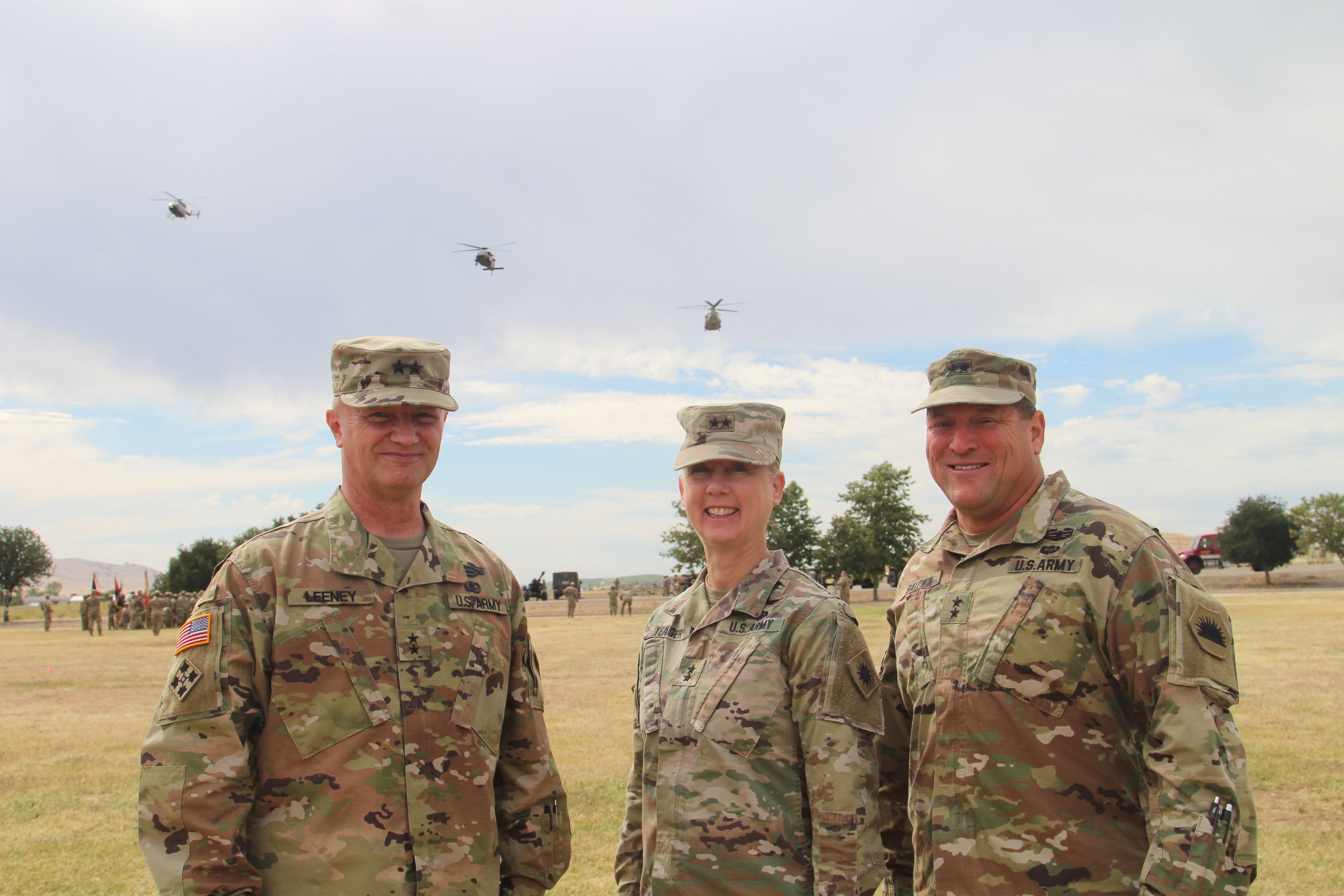 CAMP ROBERTS, Calif.— The Sunburst Division welcomed U.S. Army Maj. Gen. Michael J. Leeney as their new commander during a change of command ceremony at Camp Roberts on May 15, 2022. Maj. Gen. Laura Yeager, the outgoing commander since June 2019, passed the colors to Leeney in the formal transfer of authority and responsibility.