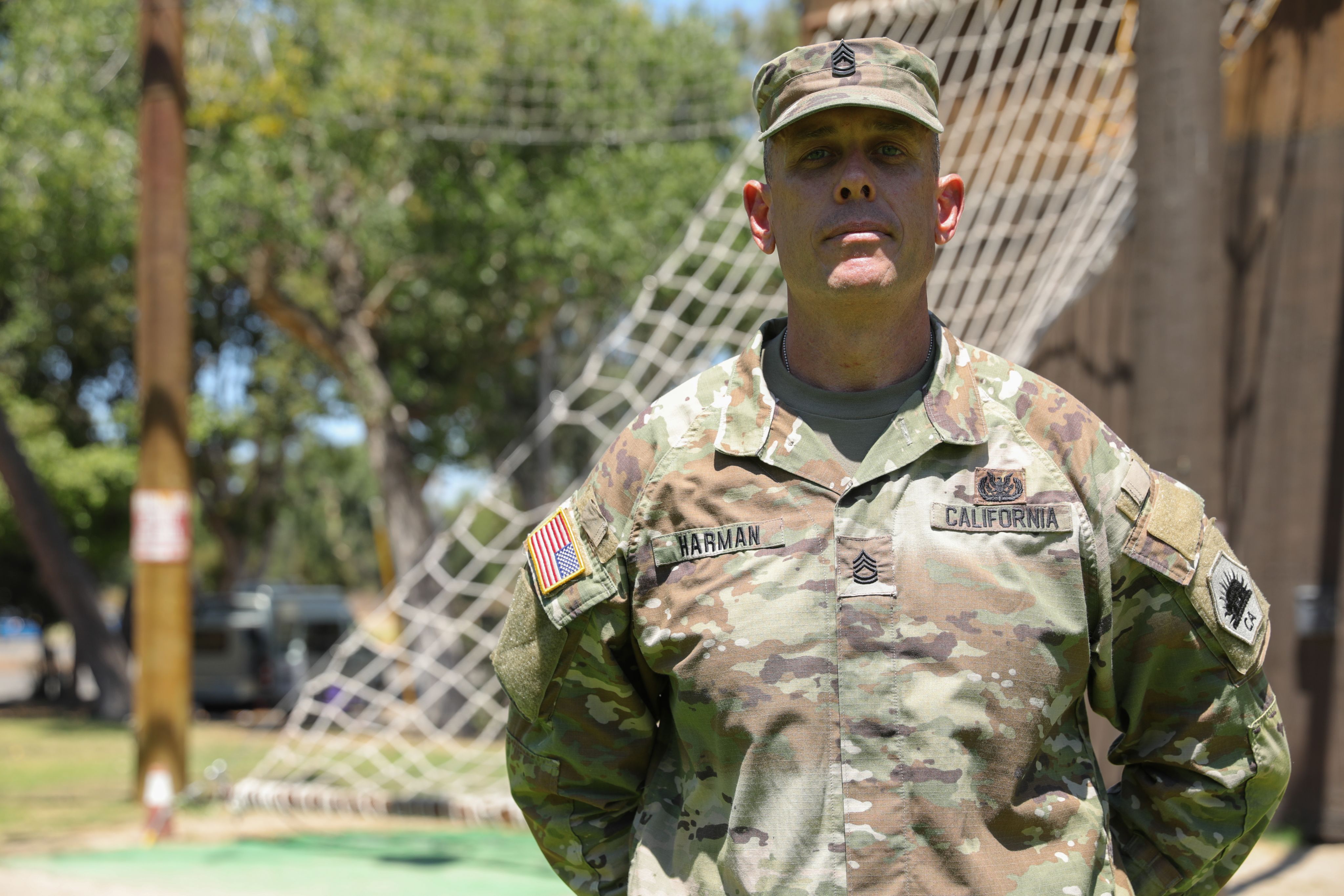 Candidates from the Sunburst Youth Challenge Academy, Joint Forces Training Base, Calif., follow each other through a rope obstacle at the Orange County Ropes Course in Anaheim, Calif., July 19, 2022. The volunteers in Sunburst are referred to as Candidates for the first two weeks, putting them through various mental and physical challenges before earning the title of Cadet. (U.S. Army National Guard photo by Pfc. William Franco Espinosa)
