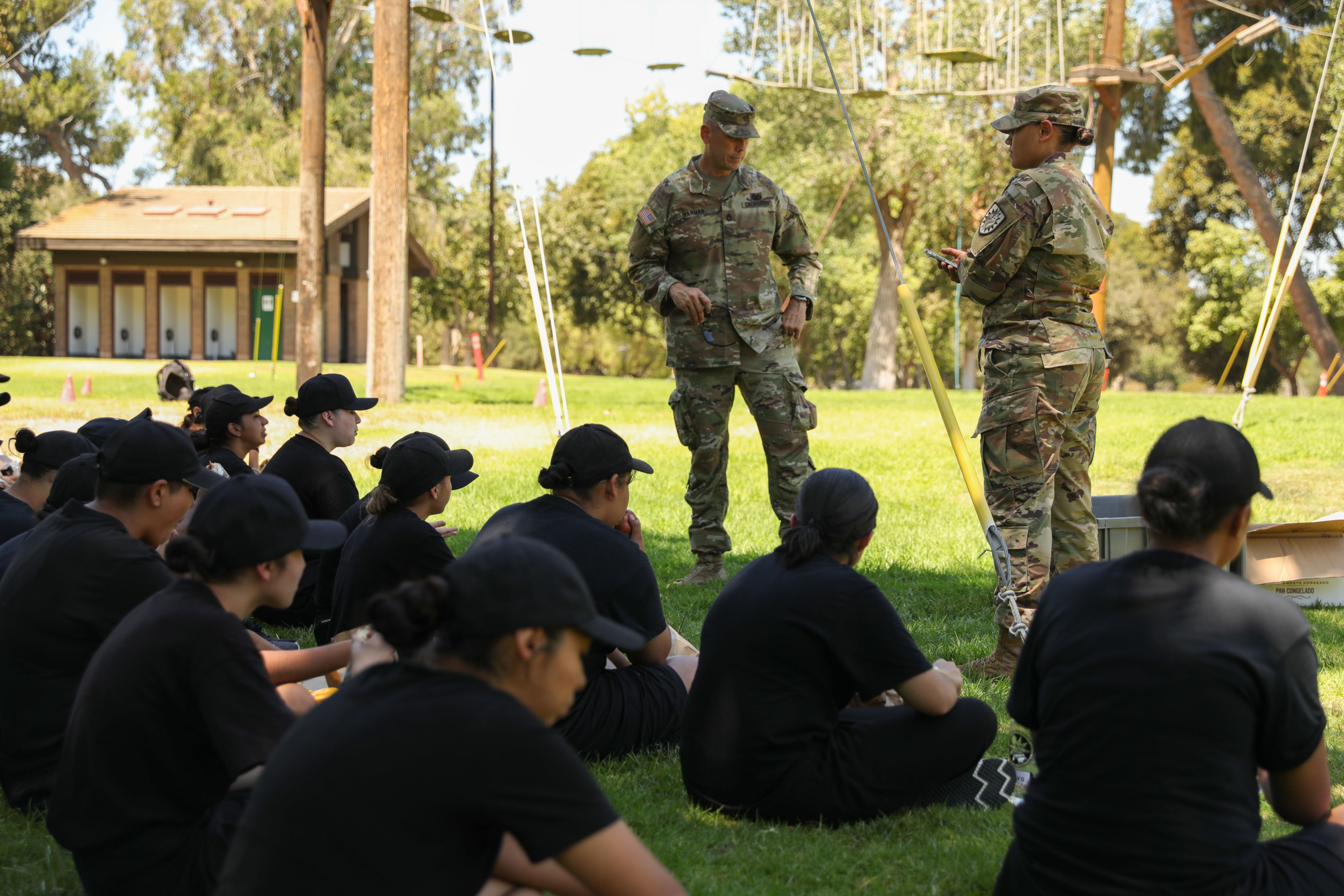 Candidates from the Sunburst Youth Challenge Academy, Joint Forces Training Base, Calif., take a break on a tower at the Orange County Ropes Course in Anaheim, Calif., July 19, 2022. Candidates that graduate Sunburst will earn a year's worth of highschool credits in the course of five and half months. (U.S. Army National Guard photo by Pfc. William Franco Espinosa)